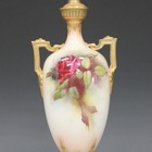 A Royal Worcester bone china vase and cover, circa 1909, painted by Reginald Austin, signed, the elongated ovoid body painted with pink roses flanked by gilt angular handles, on a gilt moulded circular foot, green printed factory marks and '247' to base, height approx 29.5cm (hairline crack to cover).