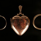 Two 9ct gold plain wedding rings, a 9ct gold heart shaped pendant locket, Birmingham 1905, a jet mounted oval pink shell cameo brooch, six similar pink shell cameo links from a bracelet, nine hemispherical jet links and one rectangular jet link.