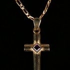 A 9ct gold and amethyst single stone pendant cross, mounted with a square cut amethyst, with a 9ct gold faceted curblink neckchain on a sprung hook shape clasp, with a box.