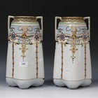 A pair of Japanese Chikusa porcelain vases, early 20th Century, each of tapering lobed form, decorated with flowers flanked by angular handles, height approx 30.5cm.