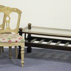 A 20th Century stained beech rustic coffee table, the rectangular top inset with glass and raised on turned and block legs united by a slatted undertier, height approx 54cm, length approx 112cm, together with a pair of side chairs.