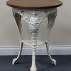 A Victorian white painted cast iron pub table, the Britannia herm supports united by a pierced undertier, diameter approx 61cm.