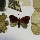A group of mostly 17th and 18th Century textiles, including a waistcoat section with silver thread embroidery, a pair of ivory silk infant's shoes, a velvet and metal appliqué butterfly and an embroidered armorial crest.