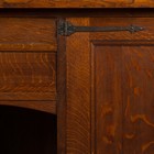 An Edwardian Arts and Crafts oak 'Lochleven' sideboard by Liberty & Co, the shelf back with a leaded glazed cabinet with turned side supports, the base with patinated handles and hinges, on block supports, height approx 189cm, width approx 183cm, depth approx 56cm. Note: similar examples of this sideboard are illustrated in 'Liberty's Furniture 1875-1915' by Daryl Bennett, p.107 and p.117.