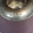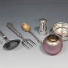 A Danish silver brandy pan with ebonized handle, Copenhagen 1933 by Johannes Siggard, a Danish silver pastry slice, the handle terminal decorated with a scene of an old lady at a spinning wheel accompanied by a cat, duck and chicken, Copenhagen 1955, a .925 silver mounted cranberry glass match strike and holder, a silver caster and three other items.