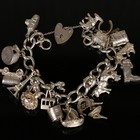 A silver curblink charm bracelet, fitted with a variety of mostly silver charms, including a bull, the Eiffel tower and a camera.