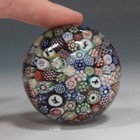 A small Baccarat millefiori glass paperweight, mid-19th Century, the close-packed polychrome millefiori canes incorporating four animal silhouettes, comprising goat, horse, dog and rooster, diameter approx 5cm (surface chips and scratches).