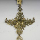 A 20th Century ecclesiastical cast brass sectional hanging cross of pierced form, fitted with two taper holders, height approx 73cm.
