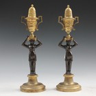 A pair of 19th Century gilt and brown patinated cast bronze candlesticks of caryatid form, each figural stem supporting an urn sconce, height approx 29cm.