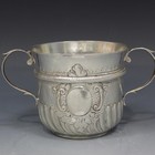 A George I silver porringer, the body with girdle and small cartouche above a half-reeded and fluted spiral band flanked by scroll handles, London 1727 by William Spackman, height approx 9.8cm.
