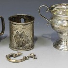 A late Victorian silver christening tankard, the cylindrical body embossed with flowers and scrolls, Birmingham 1895 by Henry Matthews, height approx 7.1cm, a silver two handled cup, London 1922 and another Victorian silver christening tankard, London 1869 (handle detached).