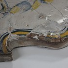 A Continental polychrome maiolica plaque, probably late 17th/18th Century, painted with a rampant lion within a blue and yellow line border, length approx 24.5cm (repairs).