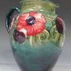 A Moorcroft pottery jug, the high shouldered ovoid body decorated with Anemone design against a green to blue ground, impressed factory marks and painted initials to base, height approx 20cm.