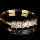 An 18ct gold and diamond five stone ring, claw set with a row of princess cut diamonds, ring size approx V, with a certificate card.