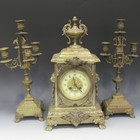 A late 19th Century French cast brass clock garniture, the clock with eight day movement striking on a bell via an outside countwheel, the case with urn surmount above a pair of lion mask and loose ring handles, on paw feet, height approx 43cm, with pendulum and winding key, flanked by a pair of matching four light candelabra.
