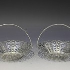 A near pair of silver bonbon baskets, each circular body with pierced sides beneath a reeded clip-on overhead handle, Birmingham 1961 by Adie Brothers Ltd and Birmingham 1967 by Elkington & Co Ltd, height approx 10cm.
