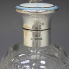 A George V silver enamel and clear glass scent bottle and stopper, the hinged cover enamelled in pale blue and mounted with a pale blue paste and marcasite set roundel, the ovoid body engraved with flowers, Birmingham 1936 by Albert Carter, height approx 13.5cm (tiny chip to edge of enamel).