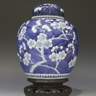 A Chinese blue and white porcelain jar and cover, mark of Kangxi but late 19th Century, the ovoid body and domed cover painted with blossoming prunus branches, underglaze blue four character mark to base, height approx 21.5cm, together with a carved wood stand.
