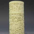 A Chinese Canton export ivory cylindrical box with screw cover, mid/late 19th Century, both pieces carved in relief with continuous village scenes of figures, pavilions, boats and trees, height approx 12.5cm.