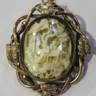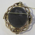 A Chinese Canton export ivory oval plaque, mid-19th Century, carved and pierced in relief with figures, pavilion and trees, the gilt metal mount with glazed front and back within an openwork meandering stem and leaf border, total length approx 6.7cm.