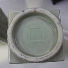 A pair of Chinese celadon glazed porcelain cong shaped vases, late Qing dynasty, each side moulded in relief with the eight trigrams, indistinct impressed seal mark to bases, height approx 22cm, with wood stands.