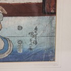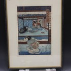 Utagawa Kunisada (1786-1865) - a Japanese polychrome woodblock oban print depicting an interior scene with seated samurai and two maidens, approx 36cm x 24.5cm, framed and glazed.