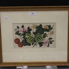 A Chinese Canton export watercolour on rice paper, mid/late 19th Century, depicting a still life study of fruit and flowers, approx 17cm x 28.5cm, together with another Canton export watercolour on rice paper depicting an exotic bird perched on a tree branch, approx 16cm x 23cm, both gilt framed and glazed.