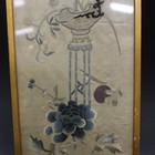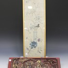A Chinese silk embroidered rectangular panel, late 19th Century, worked in coloured threads with a bat flying above a flower charged jardinière on stand and further flowers, approx 57cm x 19cm, framed and glazed, together with a Chinese red painted and giltwood rectangular panel, carved in relief with figures in a pavilion, length approx 45cm.