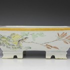 A Chinese porcelain jardinière, probably Republic period, of two handled rectangular tapering form, one side painted with a bird perched on a blossoming branch opposing a figure on horseback and attendant in a landscape, the ends painted with lines of black text, iron red four character mark and red seal mark, length approx 26.5cm.