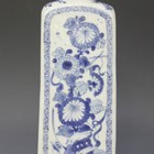 A Chinese blue and white porcelain flask, Kangxi period, of rounded rectangular form, the sides painted with opposing panels of a lotus pond and chrysanthemums, beneath a short flared neck, height approx 21cm (repaired and chipped neck).