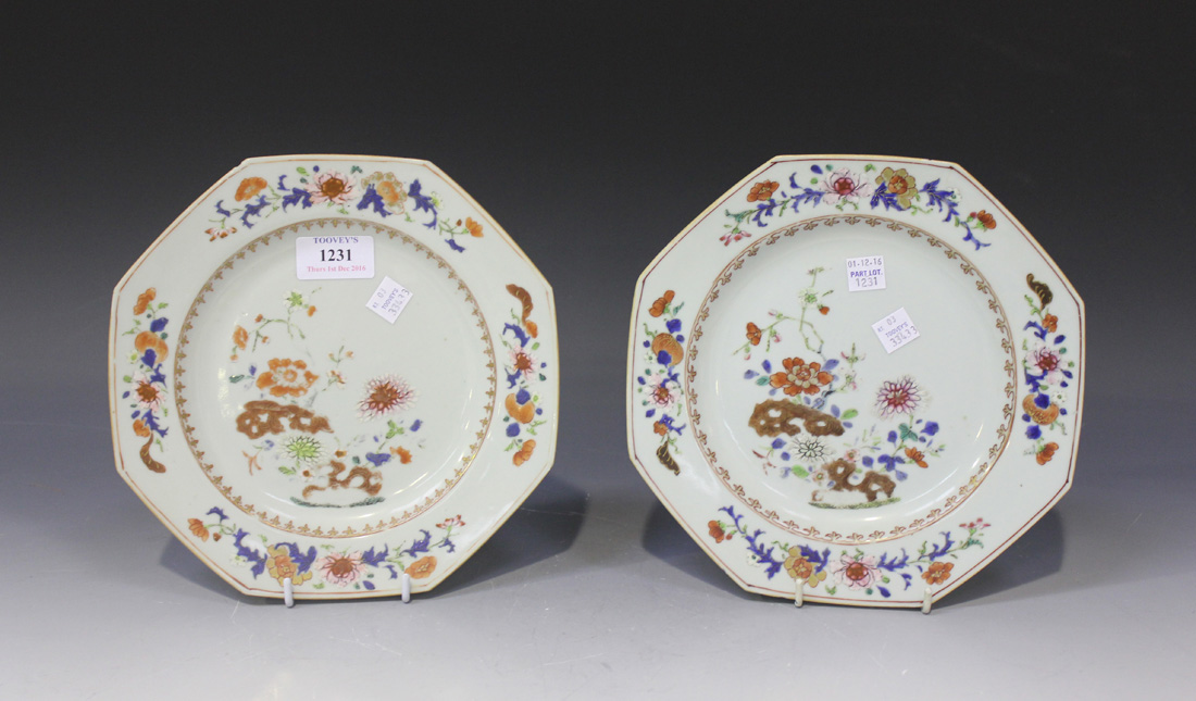 A pair of Chinese export porcelain octagonal plates, Qianlong period, each painted with flowers, width approx 22cm (minor rim chips and wear to enamels).