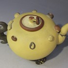 A Chinese Yixing stoneware teapot, 19th Century, with mushroom cover, the tan coloured body applied with nuts and lotus seed pod, flanked by a bat handle, impressed mark to side of spout, length approx 17cm, together with a small group of other Yixing stoneware, comprising a blue enamelled teapot (lacking cover), two diminutive famille rose enamelled teapots (one lacking cover), two other teapots (one lacking cover) and a two section dish.