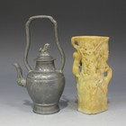 A Chinese carved soapstone spill vase, probably 18th Century, carved and pierced as two children climbing the trunk of a prunus tree, height approx 14.5cm, together with a Chinese pewter kettle and cover with overhead handle.