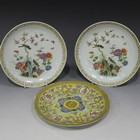 A pair of Chinese famille rose porcelain saucer dishes, mark of Guangxu but late 20th Century, each painted with two birds perched amongst blossoming branches and rocks, painted iron red six character mark to bases, diameter approx 17cm, together with a Chinese yellow ground plate, mark of Guangxu but late 20th Century, enamelled and gilt with shou medallions, vapours and waves within a keyfret rim, pseudo iron red six character mark to base, diameter approx 18cm.