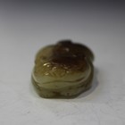 A Chinese Ming style jade pendant, carved in the form of a crouching dog, the pale celadon stone with russet inclusion across the back, length approx 5.5cm.