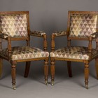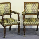 A pair of William IV oak framed elbow chairs, in the manner of Gillows of Lancaster, the square padded backs and arms above overstuffed seats, on turned and reeded supports with brass castors, height approx 99cm, width approx 57cm.