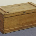 A Victorian stripped pine trunk with carrying handles, on a plinth base, height approx 43cm, width approx 89cm.