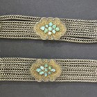 A pair of Islamic white metal five-strand multiple link bracelets, each applied at the centre and both ends with gilt panels set with turquoise, terminating in a hook clasp, each length 19.5cm (one with replacement clasp).