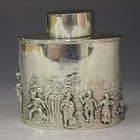 An Edwardian silver tea caddy and cover of oval cylindrical form, decorated in relief with a continuous scene of figures and buildings in a rural landscape, Chester 1904 by George Nathan & Ridley Hayes, height 7.2cm.