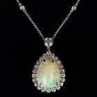 An opal and diamond drop shaped pendant necklace, claw set with the pear shaped opal in a surround of circular cut diamonds with the principal diamond mounted at the top, length 3.2cm, with a white gold neckchain, spaced with circular cut diamonds at intervals, length 41.5cm, with a case.