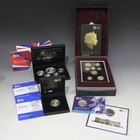 A Royal Mint 2015 silver proof eight coin year type set, with presentation box, a Royal Mint silver proof Britannia five coin set 2013, with case and box, a Royal Mint silver one hundred pounds coin 2015, a Royal Mint silver fifty pounds coin 2015 and a Royal Mint silver and gilt proof two pounds coin, The Definitive Britannia issue, with case and box.