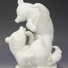A Meissen blanc-de-Chine porcelain figure group of two playful bears, 20th century, modelled on a naturalistic base, crossed swords in underglaze blue and incised 'P. 252' to base, height 19cm.