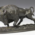 A 19th century Russian black patinated cast iron model of a bison with its head held low in an aggressive pose, standing on a naturalistic base, the underside bearing applied foundry plaques, height 18cm, length 37cm.