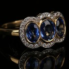 A gold, sapphire and diamond ring, mounted with three oval cut sapphires within a shaped surround set with circular cut diamonds, detailed '18ct', ring size approx N.