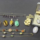 Three oval tiger's eye pendants, a malachite pendant, an imitation pearl pendant necklace, an agate bracelet, a Wedgwood brooch, a Wedgwood necklace and two costume necklaces.
