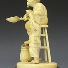 A Japanese carved ivory okimono figure group, Meiji period, modelled as a fisherman seated on a stool holding a landing net, beside a boy with rod, inset red lacquer signature plaque to base, height 20cm, the carved wooden stand bearing 'Liberty' retailer's label.