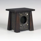 An early 20th century Arts and Crafts pewter and stained beech pocket watch display case, the hinged lid above four flared corner supports, the front inset with four moonstone cabochons, the sides worked with the mottos 'All time is no time when time is past' and 'Make time save time while time lasts', the rear panel inscribed 'Ave atque vale!', dated '22.11.1921' and bearing two sets of monograms, 'EAJW' and 'WSR', height 12cm, width 13cm.