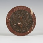 An early 20th century brown patinated cast bronze circular plaque, inscribed 'Bromsgrove Guild Worcestershire England' above a nude maiden, inset into a rouge marble paperweight base, diameter 10cm.