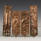 A pair of early 20th century Arts and Crafts copper door plates, worked in relief with birds, initialled and dated 'G.G.P. 1920', height 26cm, together with two other copper door plates by the same hand.