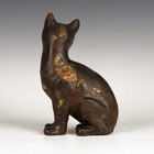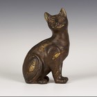 A studio pottery Gallé style model of a cat, modelled seated with a smiling expression, incised with fish motifs on a bronzed brown ground, unmarked, height 25cm (repaired).